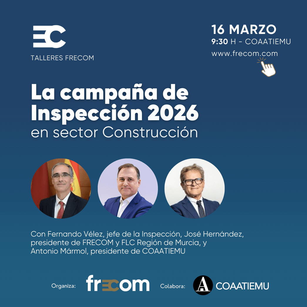 Ya puedes inscribirte a la jornada 'La Campaña de Inspección 2026 para el sector construcción' que organiza la Federación Regional de Empresarios de la Construcción de Murcia (FRECOM), en colaboración con el Colegio Oficial de Aparejadores, Arquitectos Técnicos e Ingenieros de Edificación de la Región de Murcia (COAATIEMU).