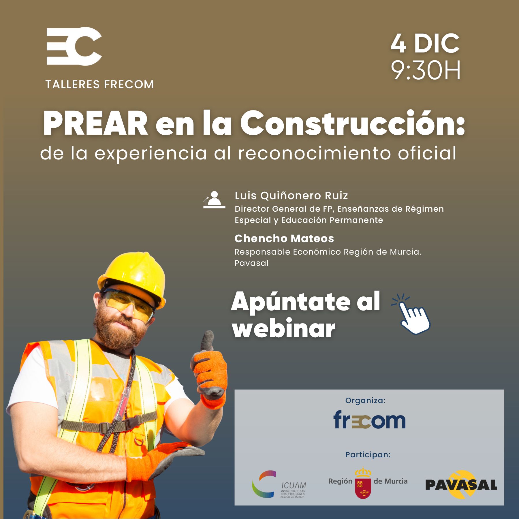 Este webinar está organizado por FRECOM (Federación Regional de Empresarios de la Construcción de Murcia), con la participación de la Comunidad Autónoma de la Región de Murcia a través de la Consejería de Educación, el ICUAM (Instituto de las Cualificaciones de la Región de Murcia), y la empresa constructora PAVASAL.